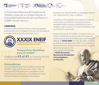 a la comunidad estudiantil de licenciatura, posgrados profesionales y de investigación, becarios de investigación y estudiosos de la filosofía a participar en el XXXIX Encuentro Nacional de Estudiantes e Investigadores de Filosofía “Desarticular la crisis actual: Perspectivas filosóficas para el cambio” a realizarse del 3 al 7 de noviembre de 2025 en la Universidad Autónoma de San Luis Potosí